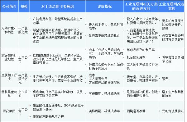 归根结底,工业互联网企业为客户提供数字化、智能化产品来创造价值,其收入也来源于为客户带来的效率提升、成本节约或者订单收入增加。我们采访了金属加工、无纺布生产制造、家居制造、医药等领域规模较大,且已经进行了工业互联网改造的制造业客户,总结了其工业互联网改造的契机以及相关评价指标: