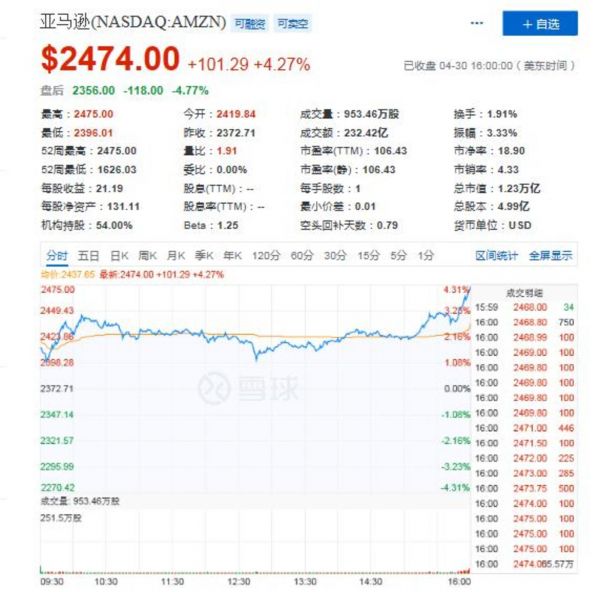 北京时间5月1日,亚马逊公布了其2020年第一季度财报。从财报来看,期内营收超预期,但净利润及每股收益不及市场预期,导致其盘后股价大幅下跌近5%。截至目前,亚马逊盘后股价跌幅4.77%,报2356美元,最新市值1.23万亿美元。由此可见,投资者对亚马逊的这份财报似乎并不满意。