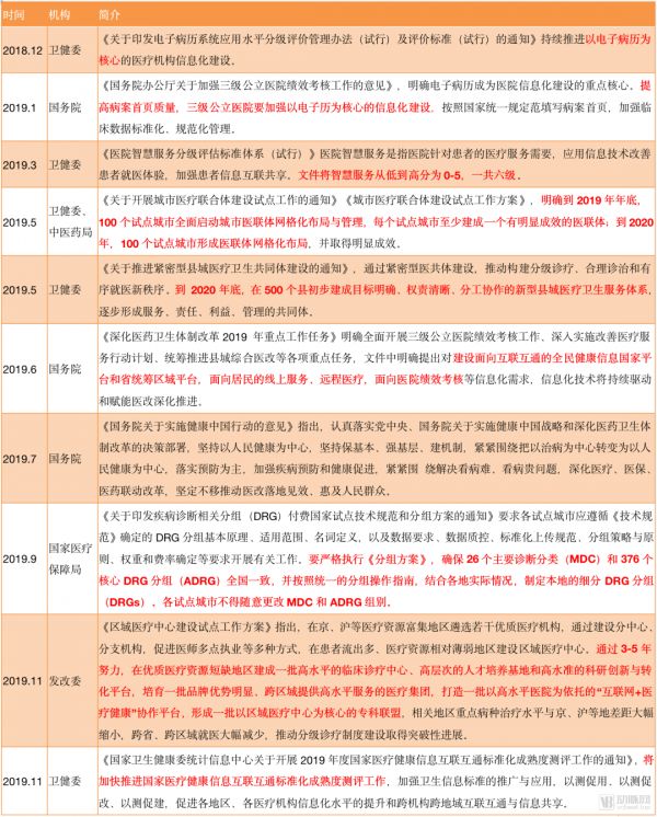 回顾政策,从2018年12月起,我们能够看到国家对于医院信息化建设重视程度的逐日提升,这种重视不仅表现在对于电子病历、智慧医院、DRG等院内信息化的建设,还提及了医联体、新型县域医疗卫生服务体系等模式建设。