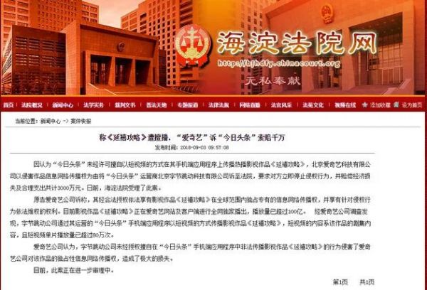 2019年,爱奇艺曾经起诉了字节跳动,原因是前者的独家版权剧《延禧攻略》在APP“今日头条”上被分段发布、推荐给用户。未经合法授权的相关短视频片段超过1300条,单条播放量最高达到110万次。