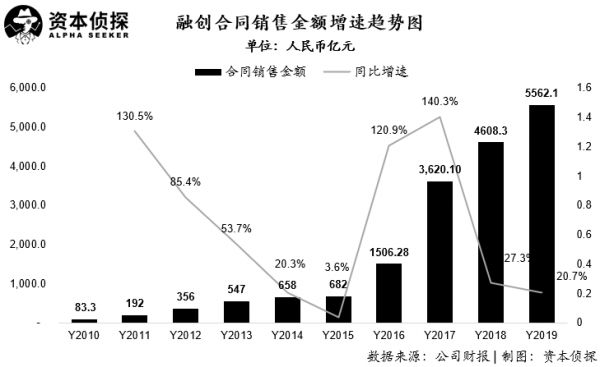 在融创对外发布的2017年业绩中,融创合同销售金额约为人民币3620.1亿元,行业排名跃升至第四名。之后的2018、2019年,融创也稳住了自己的江湖地位。