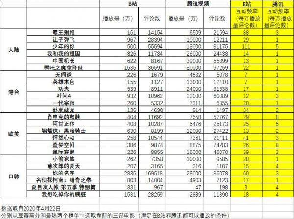 老片有很多经典作品,具备较高的艺术价值和现实意义。用户观看老片既有重温经典的需求,也有寻找认同、情感共鸣的需求,从弹幕中一个个“名场面”、“前方高能”、“哈哈哈”中获得快乐,正如当年课间的你绘声绘色地为同桌描述刚刚看过的一部电影,从同桌好奇的眼神获得满足一样。以部分豆瓣高分及热门电影为例,可以看到虽然播放量B站被全面吊打,但是B站用户的互动频率明显高于腾讯视频。