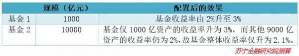 那么,是不是货币基金规模越大,收益率越高呢?其实也不尽然,特别是当市场上的既符合货币基金投资要求,收益又不错的资产相对有限的时候。为了说明这个情况,请参考以下范例:假设基金1和基金2的规模分别为1000亿元和10000亿元,当前年化收益率为2%,如果他们都找到了1000亿收益率为3%的资产,并进行了配置,结果如下: