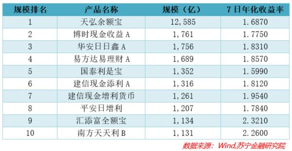 从客户的角度,同样是存款,因为规模的不同,则意味着不同品质的服务和议价能力,这就是经济学上的“规模经济”。而主流货币基金动辄百亿甚至千亿级的规模,也使得它相对散户个人存款有较多配置选择和议价能力。以下是截至4月28日,规模最大的10个货币基金产品的情况: