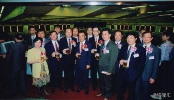 青岛啤酒H股上市。1993年7月,青岛啤酒作为第一家H股,在香港上市,图中前排左三(除最左背对镜头者)为李业广。图片来源:香港交易所