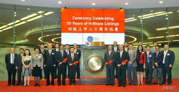H股上市二十周年志庆。图中锣左方第四位手执红锤者为李小加。图片来源:香港交易所