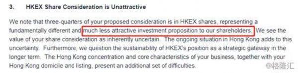首先,港交所的收购方式是现金+换股,但是就是“换股”这一点上,伦交所的股东不能接受。伦交所在她的拒信中坦言港交所的股票“不吸引”。