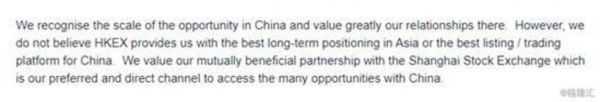 除了这两点明确的理由之外,伦交所还相当隐晦地表达了对于港交所地位的担忧。伦交所说,我们认可中国的市场规模与商机,但是我们把上交所作为合作的首选。(见下图)