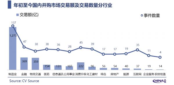 年初至今国内并购交易金额主要集中在制造、金融、物流、消费升级行业,从交易数量来看,医药、化工建材、传媒互联网等行业的并购也较为活跃。