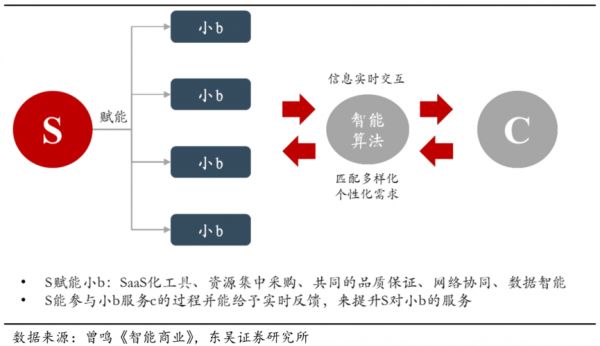 1)S为小b提供SaaS化工具。基于规模和成本的考虑,小 b 很少有自己搭建信息系统的能力,SaaS为小b提供了 相对低成本的选择。例如微盟在微信上提供的 SaaS 化服务等。