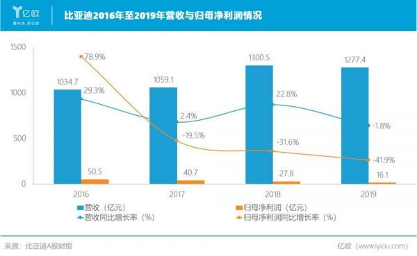 比亚迪去年的日子也不好过。2019年,比亚迪净利润为16.1亿元,同比暴跌41.9%。