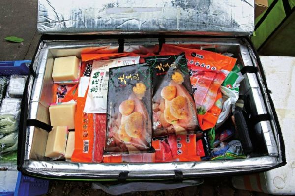生鲜类产品一般集中放置在保温盒里,内置冷藏材料以保鲜。图/禤灿雄