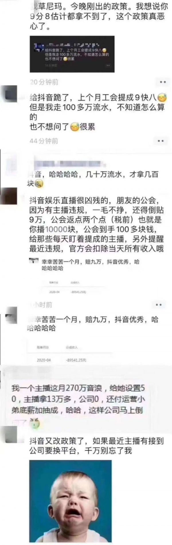 在公会群内,一些愤怒的声音质疑:公会的分成降低,变相的收入就落到了平台手里,实际上抖音此举是降低公会分成,增加了平台的收入。