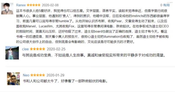这是迪士尼CEO第一次现身说法,也是迪士尼CEO的著作首次引入中国。这本书最大优点是真诚,无论是讲述自己决策时的所思所想所顾虑,还是点评同事、领导,都能做到直言不讳;其次,这本书的可读性强,内容像电影一样精彩,看看之前读过该书英文版的读者们的评论就知道了: