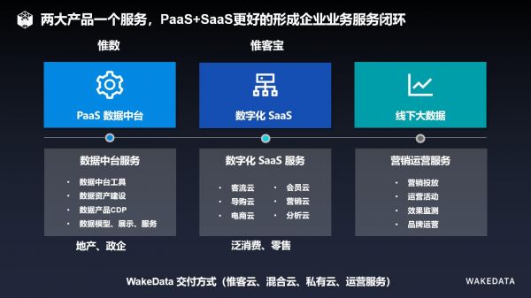 WakeData目前提供惟数平台和惟客宝两大产品及线下大数据的营销运营服务满足企业不同业务场景的数据需求: