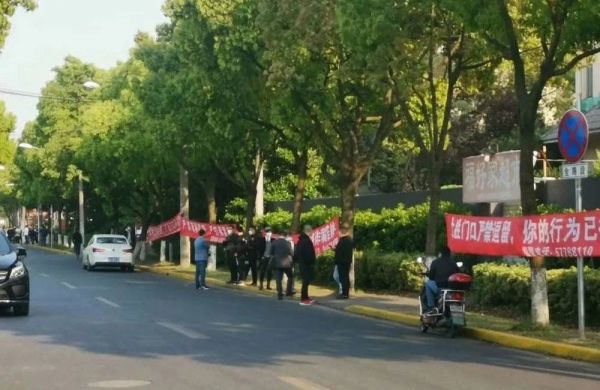 4月中旬的一天,上海大胜口罩厂门口,红色横幅拉了一串,上面赫然写着“警惕诈骗”“大胜不设代理商”“大胜门口严禁逗留”。