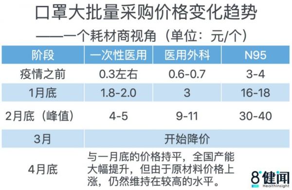 上海的医用耗材商李建(化名)发出了同样的感叹——“口罩是一天一个价”。他向八点健闻大致复盘了疫情爆发以来各类口罩采买价格的走势:从一月底到二月底价格一路见涨,至二月底达到峰值,三月起随着国内疫情得到一定程度的控制和复工后产能提升,价格开始逐步下降,目前的价格已经和一月底差不多了。