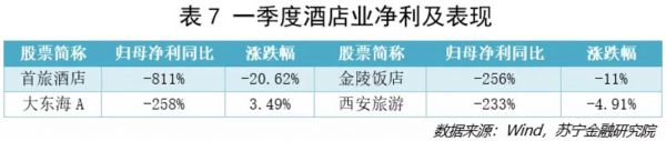 酒店行业方面(见表7),一季度酒店入住率最低降至10%以下,受刚性成本支出的影响,酒店业绩全线下挫。