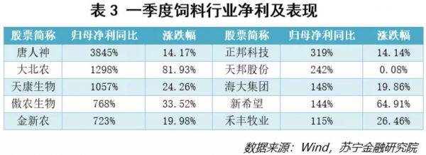 饲料行业中(见表3),表现最为亮眼的为唐人神、大北农、天康生物,这些主营饲料的企业均涉及生猪养殖,受到生猪养殖规模变化的驱动。饲料行业当前集中度不高,可关注龙头企业或者积极向下游养殖扩张的相关企业。
