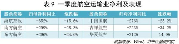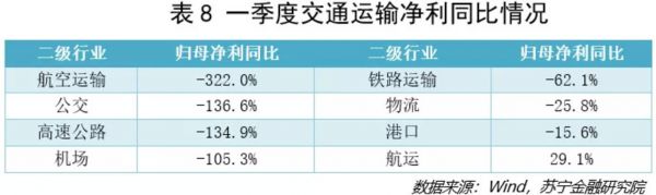 一季度,交通运输净利润同比增速为-120%,指数涨幅为-11.59%。仔细观察细分行业(见表8),分化较为明显,其中受影响最大的为航空运输、公交、高速公路和机场。