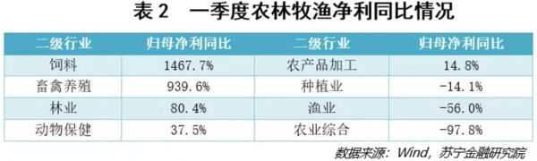 一季度,农林牧渔傲立群雄,净利润同比增速为392%,指数涨幅为15.49%(指数涨幅截至2020年5月1日,以下相同);业绩较好是受益于去年一季度的低基数、去年二季度起猪价持续上涨对产业链上下游的传导;而股价表现较好主要是受益于疫情之下市场对粮食安全的关注。仔细观察细分行业(见表2),其中表现最好的为饲料、畜禽养殖,一季度的净利润占农林牧渔板块超86%;这两个细分子行业的股价在2019年涨幅也居前。