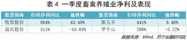 畜禽养殖行业中(见表4),表现最亮眼的是牧原股份、温氏股份、新五丰,主要受益于去年开始的超级猪周期、猪肉价格上涨。当前猪肉价格自3月份以来持续下降,但今年前三个季度生猪仍将供不应求,因此随着能繁母猪存栏量的持续回升,未来该行业的业绩将转为销售量驱动。