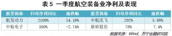 航空装备方面(见表5),业绩表现较好的为航发动力、中航电子、中航沈飞、新研股份。其中,中航沈飞取得3.75亿政府补助,对航空装备板块13.12亿的总利润产生较大影响;新研股份2019年年报和2020年一季报均出现亏损,因子公司净资产为负,计提了商誉减值15.3亿元。总体来看,航空装备业增长稳定,受疫情冲击影响较小。