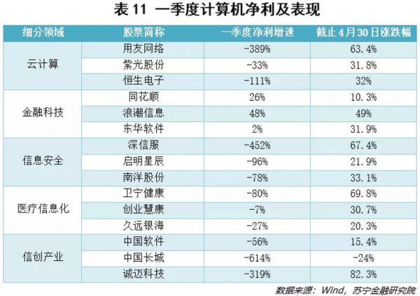 计算机行业上市公司较多,选取细分领域龙头公司(见表11)进行分析。受新冠疫情的冲击,线上办公、线上教育和线上医疗等需求快速增加。为降低线下门诊交叉感染的风险,医疗信息化将维持行业高景气度,预计行业内的订单将依旧维持快速增长。金融科技龙头企业一季度业绩表现亮眼,均录得正增长。自主信息创新对我国国家安全至关重要,为了避免被美国卡住华为、中兴的类似事件发生,以及中美贸易战的长期性和严峻性,国产替代化刻不容缓,该板块将会持续受到市场关注。