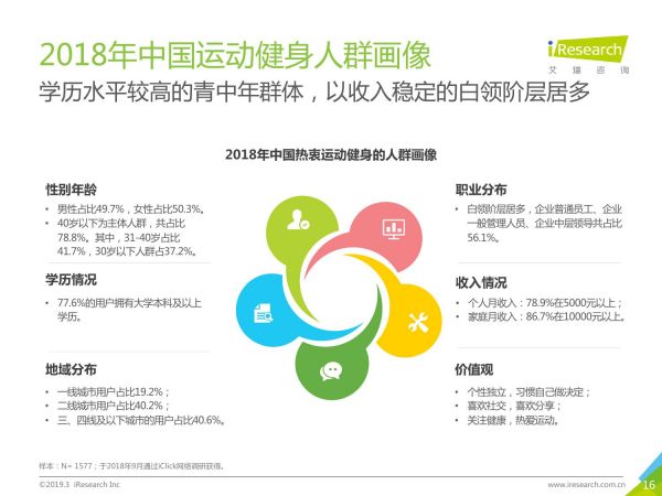 根据艾瑞咨询报告《2019中国运动健身行业发展趋势白皮书》可以看出,现代健身人群以白领居多。他们关注健康,热爱运动,喜欢社交与分享。中国主力健身人群对于健身产品的高效性、居家属性、社交娱乐属性...都有潜在需求。