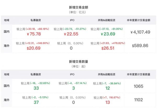 新增交易数量:该7日交易周期内新增99起交易事件,相较上一周期内整体投资数量有小幅上升,降幅达到17.5%。