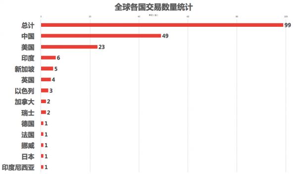 交易数量:该7日交易数据显示:全球新增99起交易事件,中国交易数量占全球交易数量的五成份额,中美两国交易数量占全球交易总数量的72.73%。