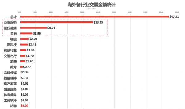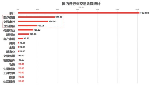 交易金额:该7日交易数据表明:吸金能力排名前三的一级行业(更全行业知识图谱及细分行业统计,上鹰眼投研APP可了解全貌)分别为医疗健康、交通出行与企业服务,其中TOP3行业交易金额占国内总交易金额的70.98%,资金流向TOP3行业较为集中。