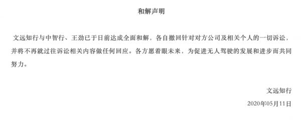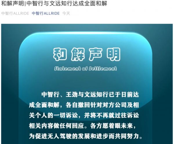 文远知行和中智行在今日均发布声明,称文远知行与中智行、王劲达成和解,各自撤回针对对方公司及个人的一切诉讼,并将不再就过往诉讼和相关内容做任何回应。