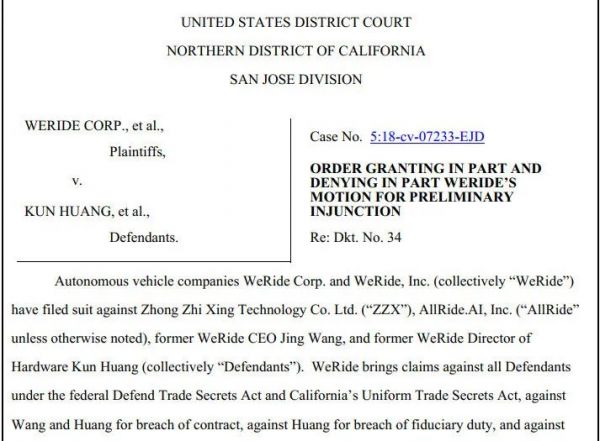 2019 年 1 月,加州地区法院颁布了临时禁令,要求中智行交出相关代码和资料,并指证出获得商业机密的人员。