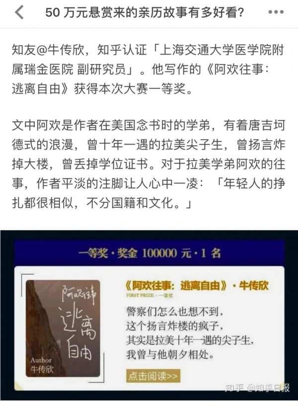 大赛评委包括贾平凹、李敬泽、陈晓楠、叶伟民、梁边妖等作家、编剧、新闻出版界人士及知乎用户代表。最终,15名获奖者共同分享了50万元奖金。一等奖作品的副标题叫《逃离自由》,主人公是作者在美国留学时的学弟(是不是特别有知乎内味儿)。