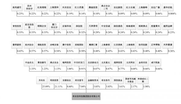 齐向东直接25.89%的股份,并通过其控制的安源创志、奇安叁号间接控制12.45%的股份,合计持有38.34%的股份;中国电子旗下的明洛投资则持有21.11%的股份,为第二大股东。其他持股超1%的股份还包括IDG资本、沸点资本、中金资本等。