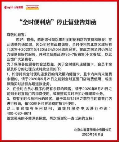 5月11日,全时便利店在公众号发布了《“全时便利店”进行营业调整告知函》,函中称,全时便利店北京地区所有门店将于5月20日24时正式关闭。
