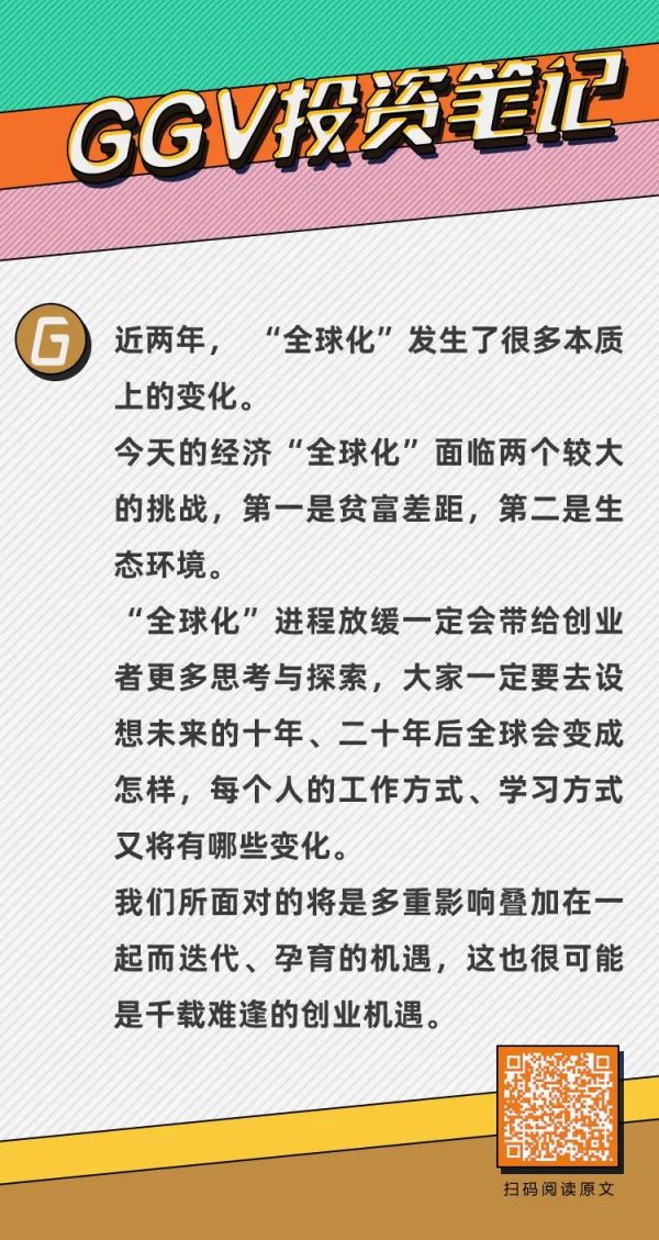 “全球化”进程放缓一定会带给创业者更多思考与探索,大家一定要去设想未来的十年、二十年后全球会变成怎样,每个人的工作方式、学习方式又将有哪些变化。这些变化一定来自于地缘政治和科技发展的影响。