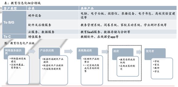 从产业链条来看,教育信息化领域细分为两大类(参考民生证券报告):