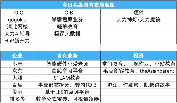 而互联网大公司在进军教育公立校领域时,主要集中在 TO C+TO B 领域,也都分别选择了自己有优势的角度切入: