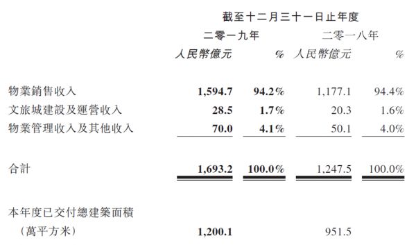 2019年度,融创中国物业销售的收入占比高达94.2%,文旅城建设及运营收入占比仅1.7%,物业管理收入及其他收入占比4.1%。