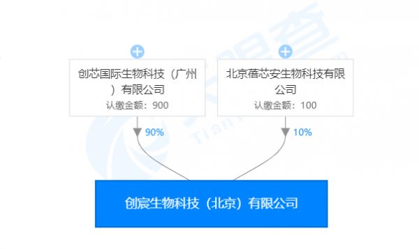从股权结构看,创芯国际生物科技(广州)有限公司(以下简称「创芯国际」)出资900万,占股90%北京蓓芯安生物科技有限公司(以下简称「蓓芯安」)出资100万,占股10%。创芯国际另外全资成立了创宸(广州)生物科技有限公司。