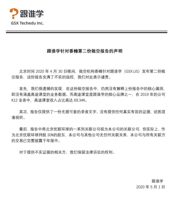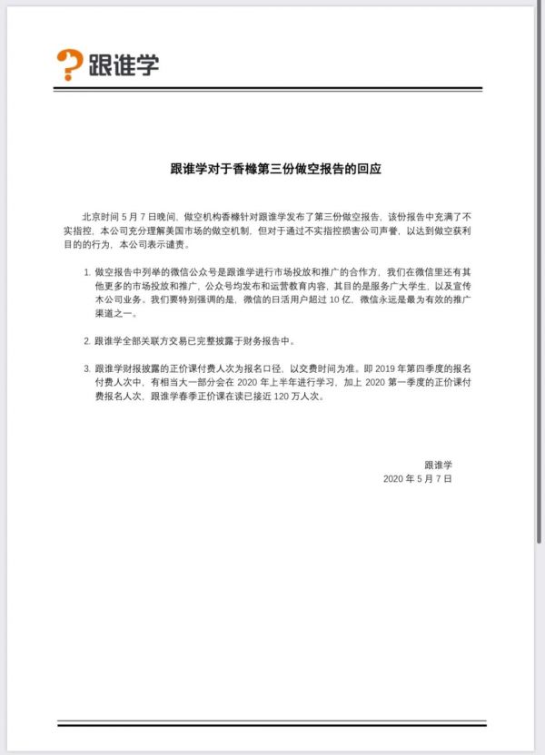 5月8日0点刚过,跟谁学在其官方公众号回应称,该份报告中充满了不实指控,公司充分理解美国市场的做空机制,但对于通过不实指控损害公司声誉,以达到做空获利目的的行为表示谴责。回应还强调,跟谁学全部关联方交易已完整披露于财务报告中。