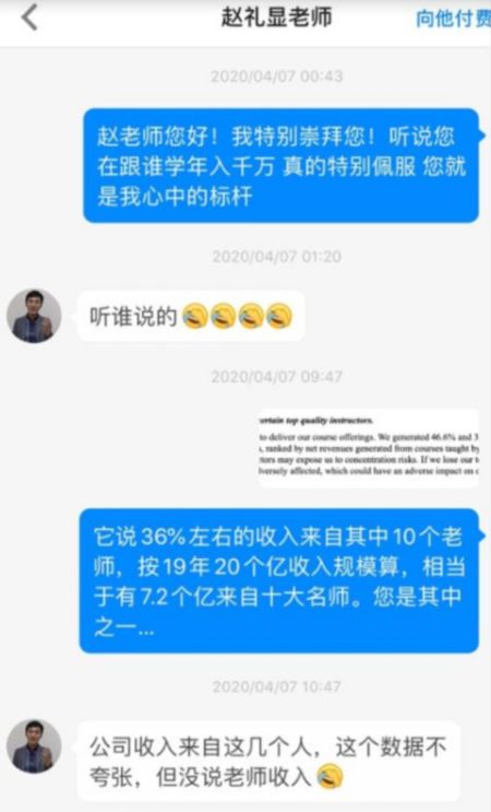 天蝎指出,若按财报数据,2019年跟谁学的21亿元营收中有36%即7.2亿元来自十大名师,则名师平均平台分成是上千万级别。而天蝎根据报告中展示的与“十大名师之一赵礼显”的聊天记录推测,其年薪并无千万。