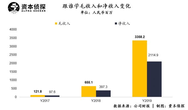 根据跟谁学4月3日发布的2019年年报显示,其2019年全年净收入21.149亿元人民币,同比(较上年同期)增长432.3%。收入快速增长,主要是由于公司2019年K-12付费课程注册学员数量的大幅增加;同时,公司在2019年针对K-12课程也进行了涨价。