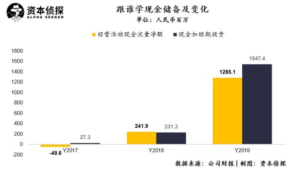 此外,跟谁学经营活动现金流量为正,且保持增长。跟谁学2019年经营活动现金流量净额为12.85亿元人民币,远高于2018年的2.42亿元人民币。公司账面现金及短期理财余额也达到历史最高的15.5亿元人民币。优异的现金储备,也能帮助进一步拉新。