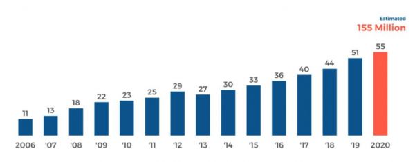 2019年开始,播客从一个小众产品,变成了大多数人用的东西。2019年的统计,美国一半以上人口听播客,到今年,这个趋势还在继续。具体数据,12岁以上的美国用户中,55%是收听播客的,大概有1.55亿的人口。这个数据对“听播客的人”的界定是,每个月至少听一次。