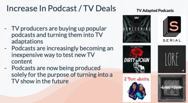 在过去几年有一个比较大的趋势,有剧情的播客越来越多,它可能会成为未来的一种方式,就是卖IP。我们公司自己之前也做了一个广播剧节目,节目本身不赚钱,但我们现在就在卖他的IP,把 IP卖给迪斯尼或者好莱坞的电影公司,他们会更愿意买播客 IP。因为这些IP在播客已经积累了很多用户,这些用户会转成这个节目的粉丝,或是至少证明这个节目的话题ok。