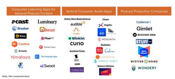 这几家公司就覆盖了我前面说的这个行业最主要的三类。一类做平台,二类是垂直类的audio app,比如喜剧、说书的垂类app。第三类是做生产服务的,包括剪辑、存储,这些都是大家关注的一些领域。在美国,相对来说,因为它商业规则比较简单清晰,也比较透明,而且它的整个行业是比较赚钱的,所以大家整体上竞争没有那么激烈。