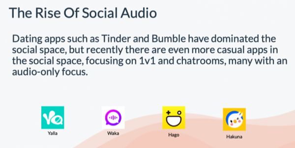 他们比较看好的三块,第一是技术,第二是生产工具,第三是音频社交(Social Audio),相当于偏社交娱乐型的音频平台,美国现在其实还没有一个特别好的平台。反而在中东、东南亚,像Yalla、Waka、Hago这些都已经跑出来了,美国这还缺少能把这事做起来的音频社交平台。